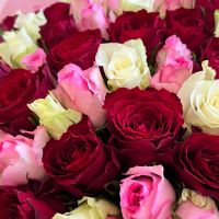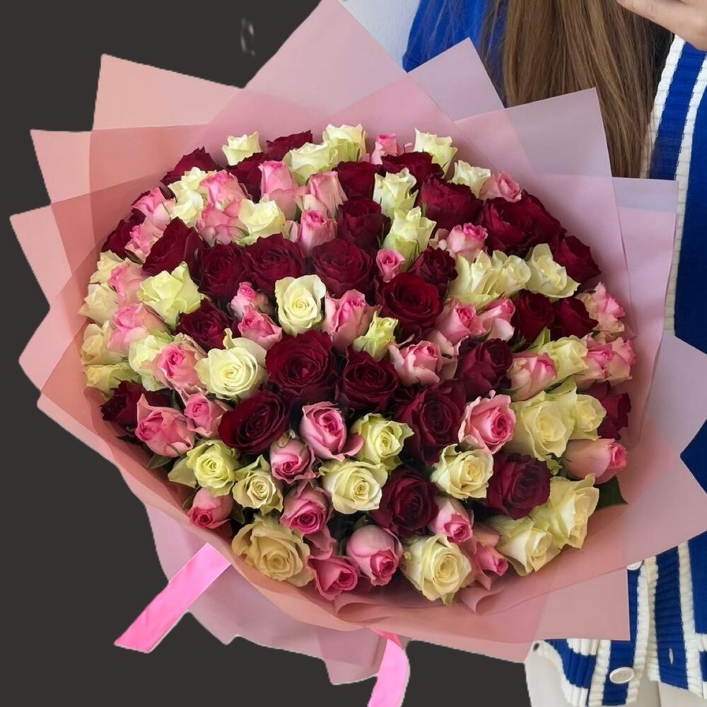 Букет из 101 розы 40 см в миксе оттенков — это настоящее воплощение роскоши, красоты и безграничной любви. В этом великолепном сборе собраны крупные, насыщенные цвета — от нежных пастельных до ярких и насыщенных тонов — создавая гармоничный и живой цветовой микс. Такой букет станет ярким выражением ваших чувств, достойным особого праздника или искреннего признания. Его пышность и разнообразие оттенков подчеркнут важность момента и удивят получателя своей элегантностью и эстетикой.
