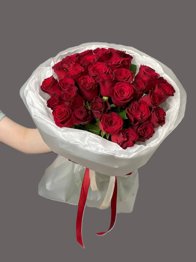 "Этот роскошный букет из 25 ярких красных роз — символ страсти, любви и искренних чувств. Каждая роза словно воплощение нежности и красоты, собранные в элегантную композицию, которая идеально подойдет для особых моментов и выражения глубоких эмоций.