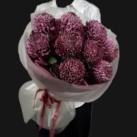 «Бигуди» — букет?трансформация в каждом бутоне читается движение, будто лепестки застыли в лёгком вихре. Одноголовые хризантемы с их характерной шаровидной формой и слегка закрученными кончиками создают удивительную игру текстур. Композиция выглядит одновременно изысканно и непринуждённо — как произведение современного флористического искусства, где каждая деталь на своём месте.