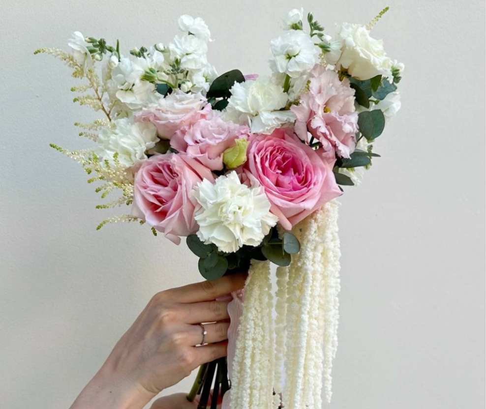 Букет невесты, в котором сочетаются нежность эустомы и пышность пионовидных роз, представляет собой воплощение элегантности и стиля. Амарант добавляет красочные акценты, создавая ощущение изобилия и праздничного настроения. Астильба приносит в букет легкость и изящество своими пушистыми соцветиями, а диантус завершает композицию, добавляя сладкие нотки своими мелкими, но яркими цветами. Этот букет — истинное отражение романтики и красоты свадебного дня.