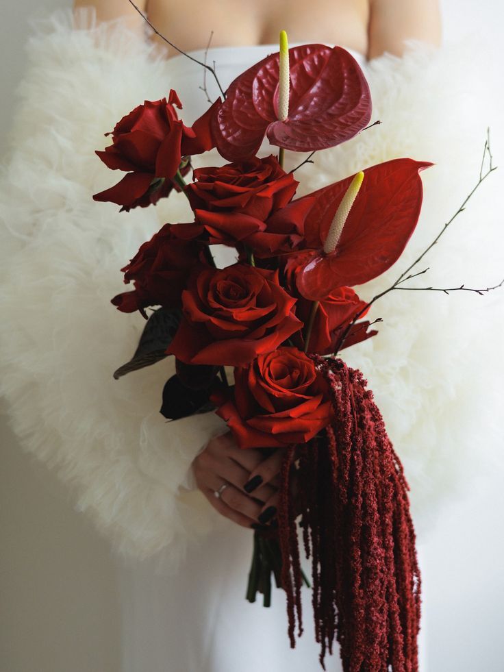 Изысканное сочетание классических роз и экзотических антуриумов создает неповторимый образ, где встречается дерзость, а традиционность переплетается с современностью. Каждый цветок тщательно подобран, чтобы подчеркнуть красоту и индивидуальность невесты.