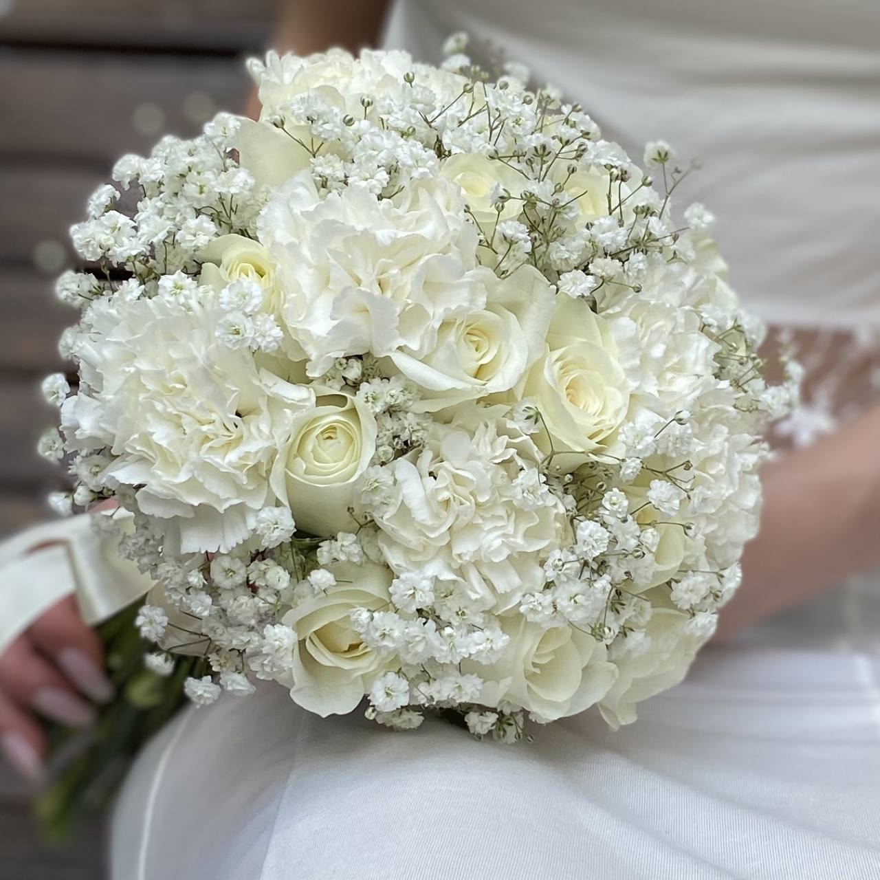 Букет Невесты из белых роз и диантусов