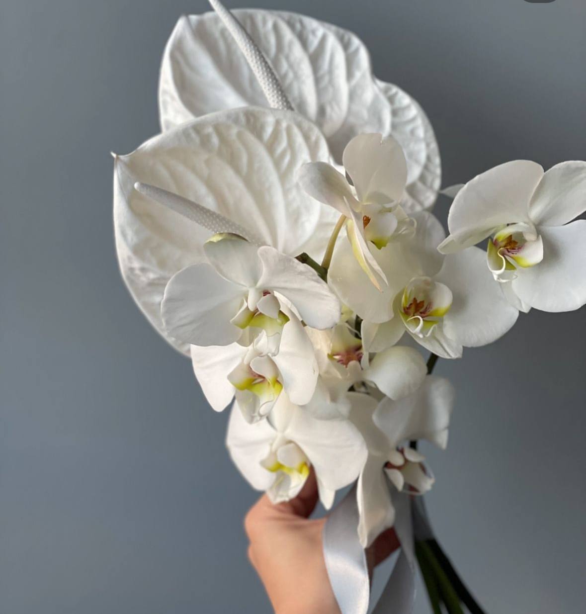 Букет невесты с антуриумом и орхидеей — это символ экзотической красоты и утонченного вкуса. Антуриум с его блестящими, как лак, крупными листьями и ярким соцветием-покрывалом добавляет букету страстные нотки и смелость дизайна. Орхидеи, словно бабочки, нежно касаются лепестками друг друга, создавая воздушное облако элегантности. Вместе эти цветы образуют не просто букет, а настоящее произведение искусства, которое будет украшением любой свадьбы.