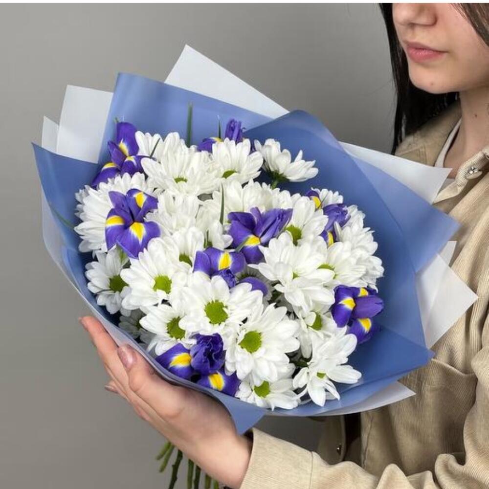 Букет "Прозрачные мечты" — это изящная композиция, в которой гармонично сочетаются хризантемы и ирисы. Хризантемы, с их округлыми формами и яркими оттенками, придают букету живость и энергетику, а ирисы с их утонченными лепестками добавляют нотку романтики и грации. Эта комбинация создает эффект легкости и воздушности, словно олицетворяя мечты и надежды. Нежные цветы сопровождаются зелеными листьями, которые подчеркивают их яркость и свежесть.