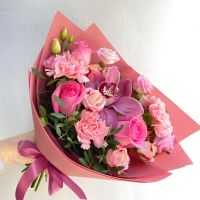Нежный букет,чтобы порадовать родных и близких в любое время дня и ночи включает в себя роскошную орхидею цимбидиум и великолепные диантусы. Орхидея цимбидиум, символизирующая красоту и изысканность, придает композиции утонченный и элегантный вид. , эустома в свою очередь, добавляют нежности и свежести, создавая гармоничное сочетание с орхидеей. Этот букет подчеркнет особый стиль и изысканность вашего вкуса, идеально подойдет как подарок на особый случай или для выражения чувств к близкому человеку.