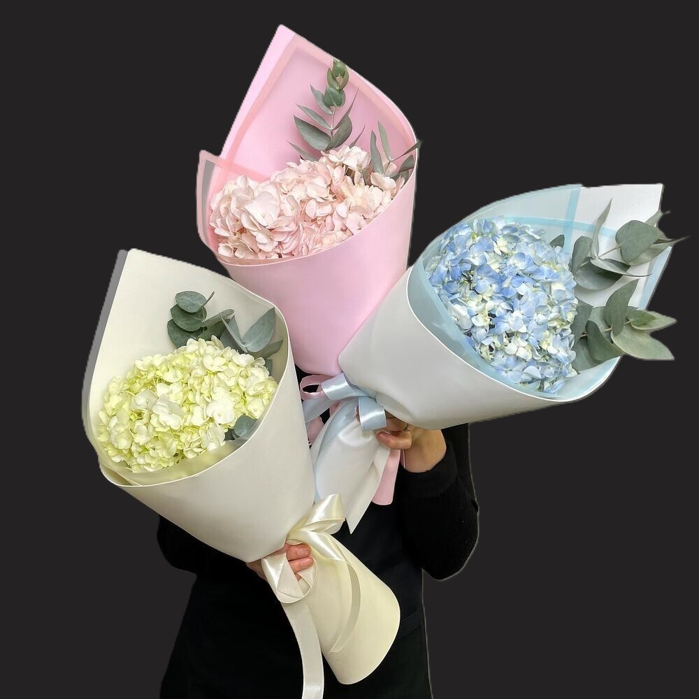 Букет "Принцесса сердца" — это изысканная композиция, которая привлекает своей нежностью и утонченностью. Основным элементом букета является гортензия с крупными, пышными цветами, символизирующая грацию и элегантность. Их мягкие оттенки создают атмосферу романтики и уюта. Дополняет букет свежий эвкалипт, который не только придает ему изысканность, но и наполняет композицию приятным ароматом. Листья эвкалипта добавляют текстуру и контраст, подчеркивая красоту гортензии.