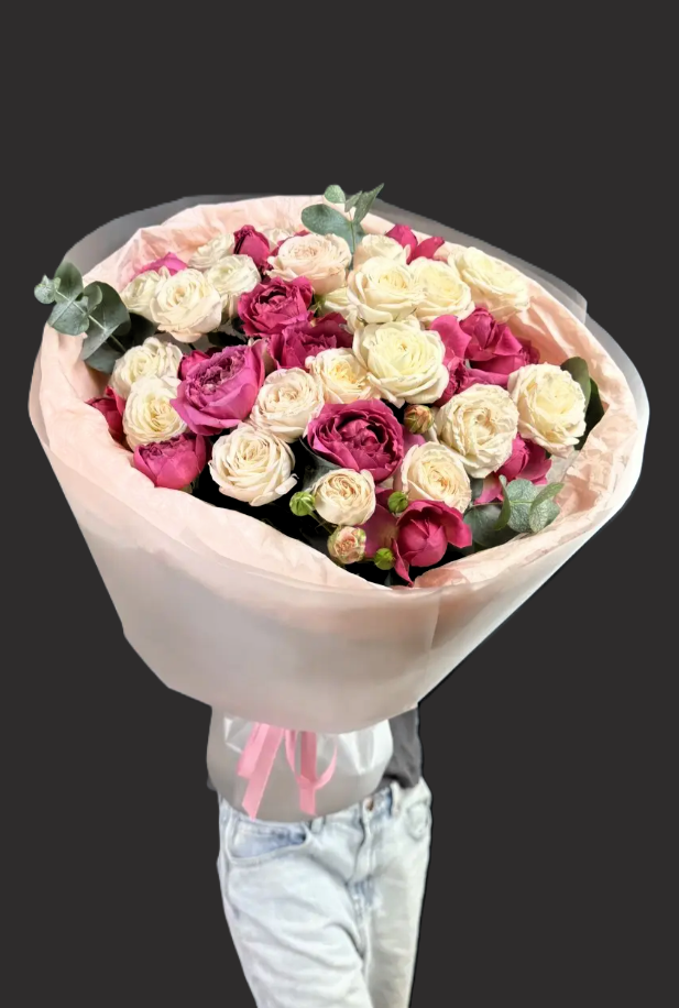 Кустовые пионовидные розы создают неповторимую игру оттенков, где нежные лепестки раскрываются постепенно, даря всё новые грани красоты. Их пышные соцветия напоминают садовые розы, а аромат заполняет пространство