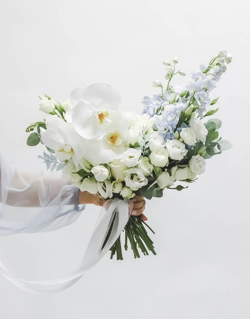 Букет невесты с орхидеей фаленопсис, дельфиниумом и эустомой — это элегантный и изысканный выбор для свадьбы. Орхидея фаленопсис, с её изящными лепестками, придаёт букету роскошный и тропический шарм. Дельфиниум добавляет нежные голубые или фиолетовые оттенки, символизируя доброту и радость. Эустома, с её мягкими цветами, дополняет композицию романтичной ноткой.