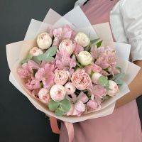 Гармоничное сочетание пионовидных роз и альстромерий создает особое настроение: пышность и благородство роз уравновешиваются скромной грацией альстромерий, образуя букет, который говорит тысячу слов без единого звука. Изысканная композиция из кустовых пионовидных роз и нежных альстромерий создает неповторимую симфонию природной красоты. Пышные бутоны роз, похожие на старинные пионы, источают легкий сладковатый аромат, а изящные альстромерии добавляют букету воздушность и легкость.