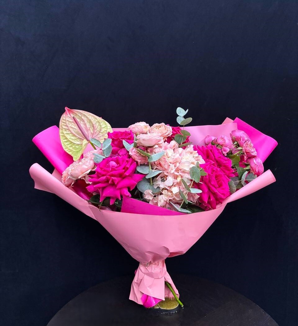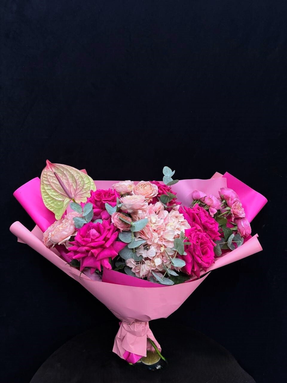Французские розы#nbsp;задают тон всей композиции, их изящные бутоны источают тонкий аромат и очаровывают своей утончённой красотой. Кустовые пионовидные розы#nbsp;добавляют композиции объём и романтичность, их пышные соцветия напоминают о старинных садах. Антуриум#nbsp;привносит в букет нотку экзотики и элегантности, становясь ярким акцентом всей композиции