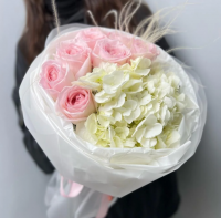 Пионовидные розы с их пышными бутонами и нежными лепестками создают основу композиции, наполняя её романтикой и очарованием. Их бархатистые лепестки, словно шёлк, хранят в себе тепло солнечных дней. Гортензии добавляют букету воздушность и объём, создавая гармоничное сочетание с розами.