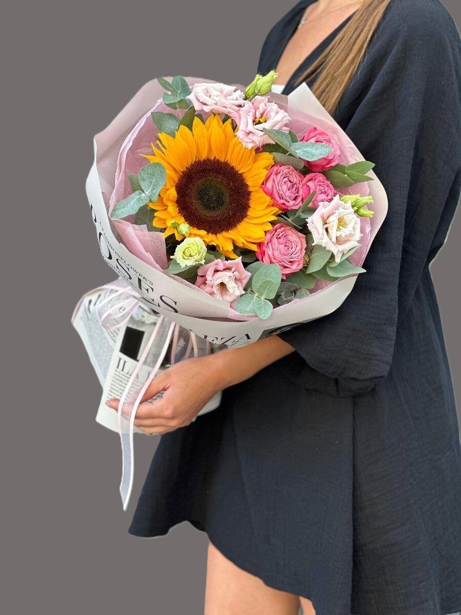 Букет "Солнечный зайчик" — это яркая и жизнерадостная композиция, в которой сочетаются крупный подсолнух, нежные эустомы и кустовые розы. Теплые солнечные оттенки подсолнуха в гармонии с мягкими цветами создают ощущение радости и оптимизма. Этот букет идеально подойдет для поднятия настроения, поздравления или просто чтобы подарить солнечное настроение близкому человеку.